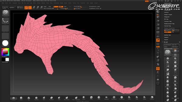 尾巴的制作是先雕刻外型,粗略的形体完成后再拓扑。拓扑的步骤是先选择Z球,然后选择RIGGING工具选择要拓扑的物体,最后选择TOPOLOGY中的EDIT TOPOLOGY开始拓扑(方法2,也可减面后在Maya中拓扑中模)。(图12)