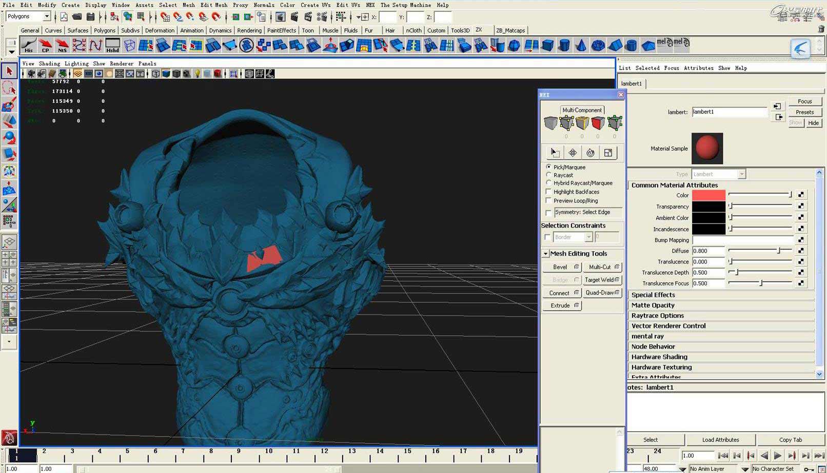 制作完高模后,我先是再把高模一个个的减面后再导入到Maya中用NEX 工具把高模拓扑成面少的低模。因为模型过于复杂,所以我是分阶段的一个个的拓扑。先是拓扑头部,然后是头部加身体,再是身体加手臂,最后是整个模型。