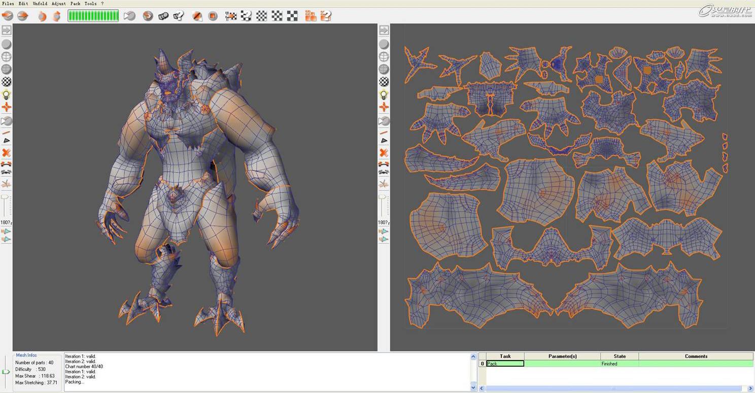 我用的是Unfold3d来分UV的,非常方便的UV拆分工具。把模型导入后就可以划线选择要拆分的部分。(图29)