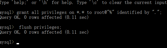 授予root所有权限:grant all privileges on *.* to root@"%" identified by ".";