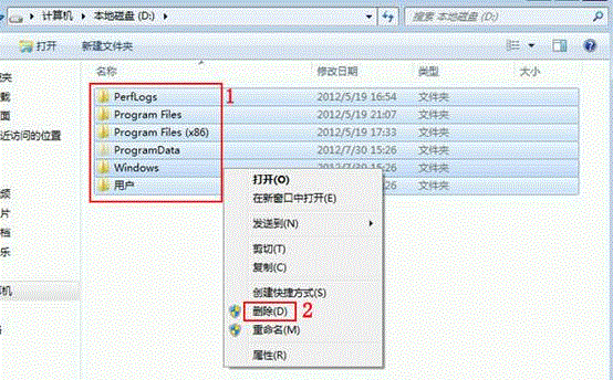 8、在 D 盘根目录下,使用鼠标左键配合 Ctrl 热键选中Perflogs、PRogram Files、Program Files(X86)、ProgramData(默认为隐藏属性,不删除也不影响,大小仅为五六兆左右)、Windows、用户共六个文件夹(除此之外的任何文件夹不要删除,避免数据丢失)。选中后在文件夹上点击鼠标右键,在弹出菜单中选择“删除(D)”按钮。如下图所示: