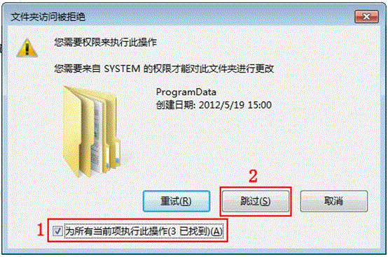 11、如系统提示文件夹访问被拒绝,则可勾选“为所有当前项执行此操作(A)”,然后点击“跳过(S)”按钮。如下图所示: