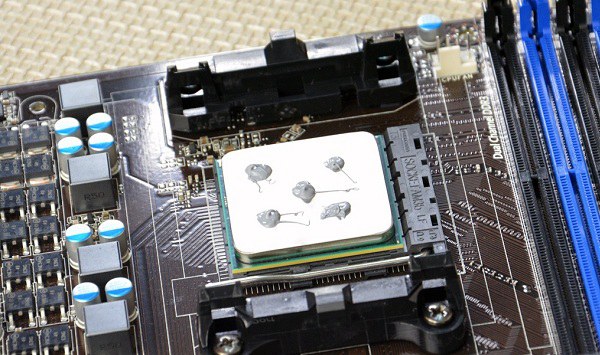 我们将附送的硅脂取少量挤到CPU表面上,也无需其他工具来涂抹硅脂。这里我们点出了 五饼 图案,就是初步将硅脂均匀分布,用散热器接触CPU来涂抹即可,完全可以达到我们正常使用的需要,另外主机运行后产生的热量也能进一步将硅脂分布到整个CPU表面,这一点不用担心,如下图所示。