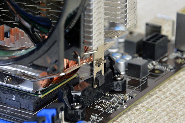 最后使用散热器上的倒置挂扣将散热器固定在CPU中即可,由于挂扣需要用到一定的手力,因此这里需要巧劲,注意是巧劲,不要用蛮力,尤其是要确定散热器在CPU正上后,方可用力固定。