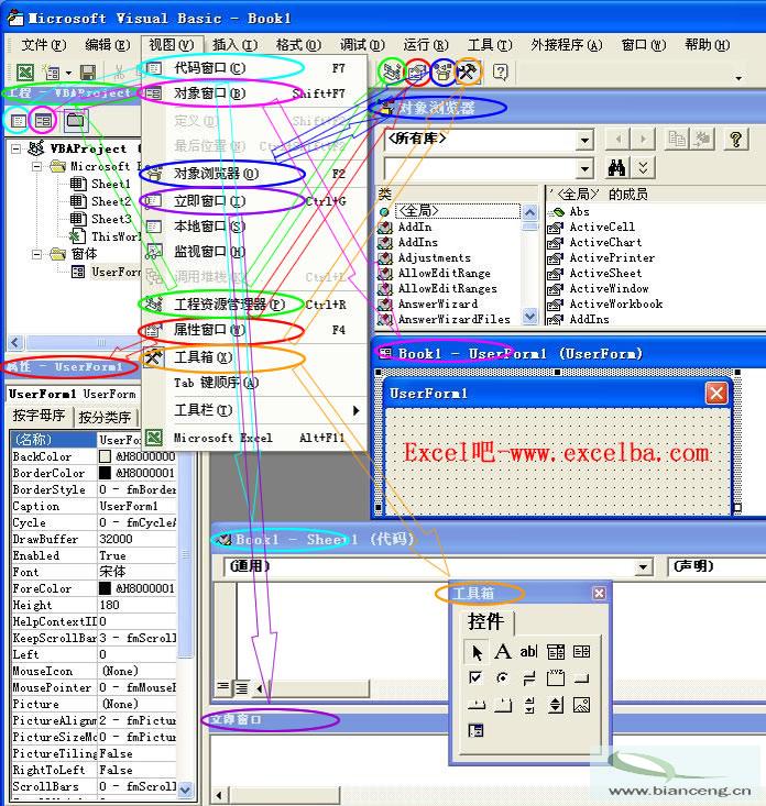 从Excel菜单中,选择工具——宏——Visual Basic 编辑器,或者按快捷键Alt+F11即可进入,不少朋友可能都没有接触过VBE,甚至连Excel中包含这个编辑器都一无所知,下面这张图就展现出VBE最常用的七个窗口,而图片也让这几个窗口更容易说明。