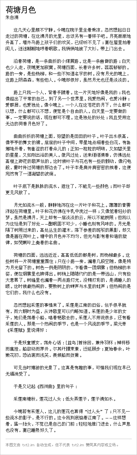 当然,上面的代码还只解决了最基本的问题,一个真正可用的文本转图片工具,还应该解决以下问题:长文本换行问题、英文单词断字问题、标点符号换行问题等。关于这些问题的分析篇幅也不短,这一次就先略过了。下面是一个综合考虑了诸多因素之后生成的《荷塘月色》的效果图: