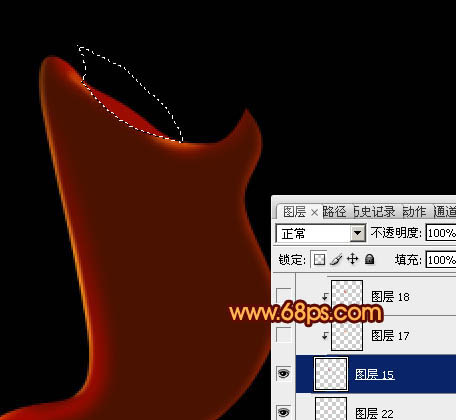 15、新建一个图层,用钢笔勾出下图所示的选区,填充暗红色。