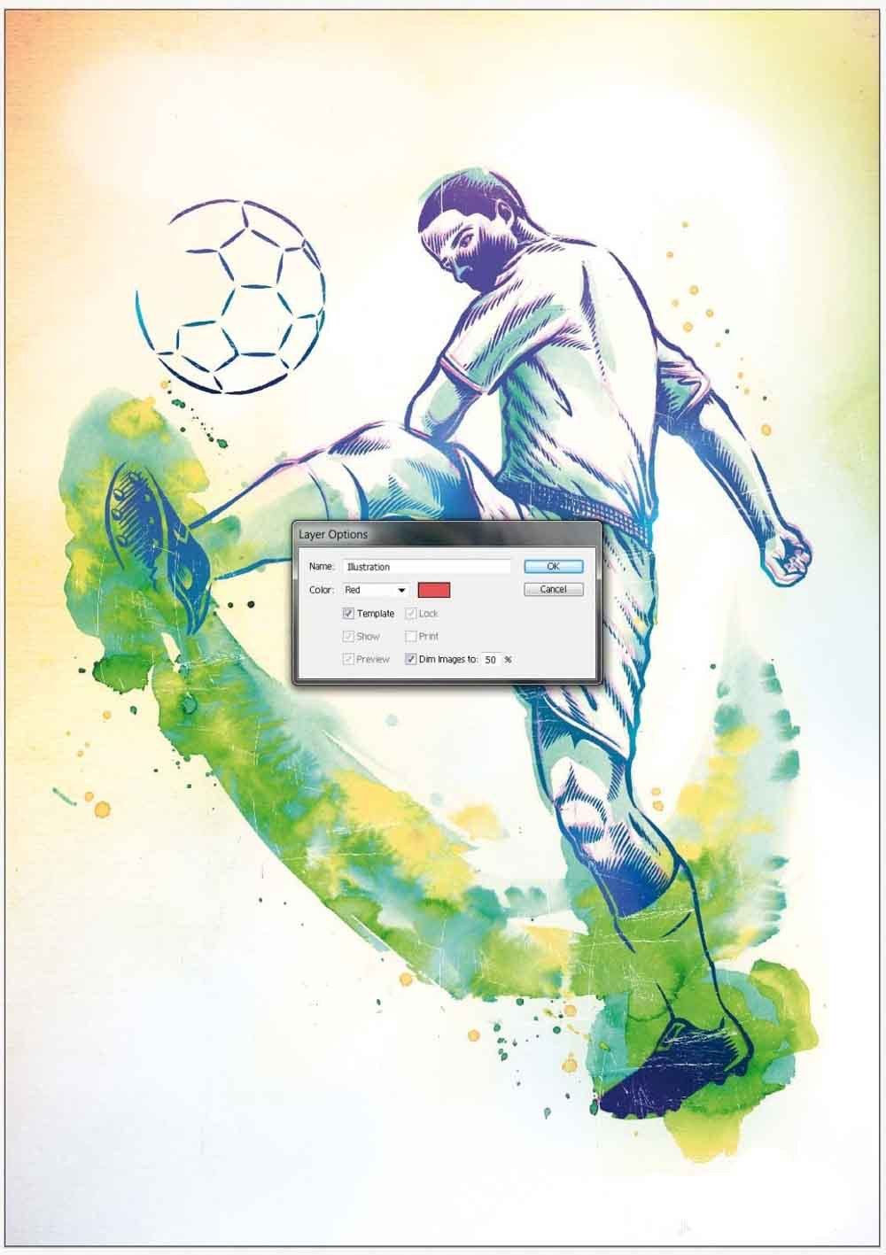 1、将提供的文件,FootballPlayer_Lineart.psd。双击图层调板(层窗口>图层),并检查模板框。命名层“插图”。