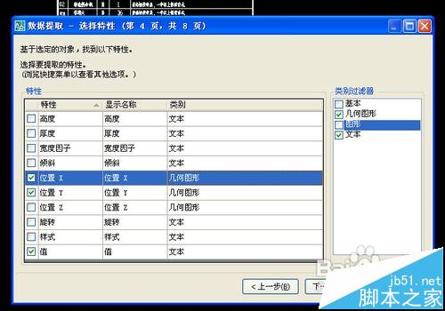 8、选择特性,按照我们之前确定的只勾选3个属性:分别是x坐标,y坐标,文字内容,点下一步