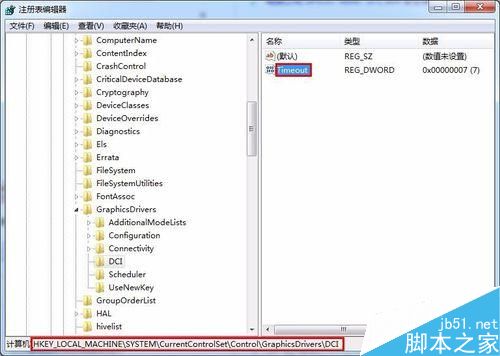依次点击“HKEY_LOCAL_MACHINE\SYSTEM\CurrentControlSet\Control\GraphicsDrivers\DCI”,双击打开右侧的“Timeout”,如图: