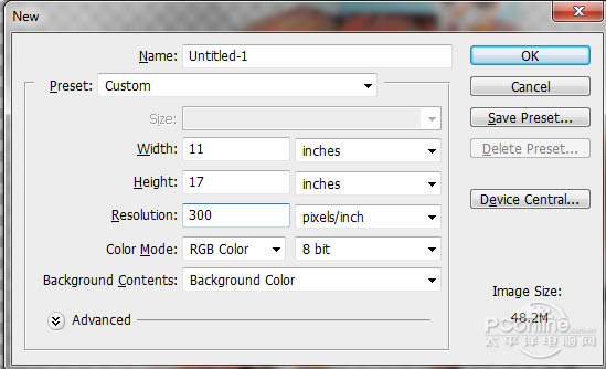 8、肖像组合完成,开始印刷效果制作。按“Ctrl+N”新建一个画布,宽高设置为11英寸*17英寸,分辨300,这样就能保证打印的精度。教程制作的印刷效果不仅可以用于这次的海报制作,还可以用在明信片和单词卡中。