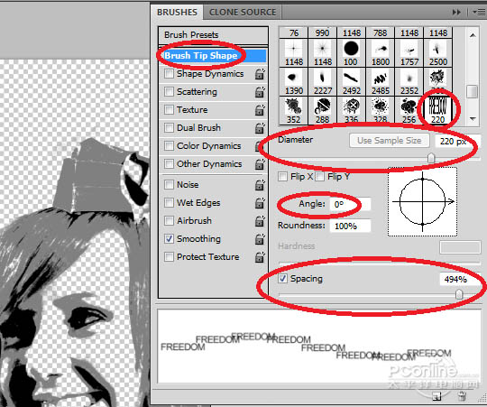 18、笔刷设置好后,再来制作海报设计。选择画笔工具,按“F5”调出画笔设置菜单。选择一个文字笔刷,勾选调整画笔笔尖形状,设置直径220像素、角度0°、间距494%.直径、角度、间距可以根据需要进行调整。设置如下图所示。