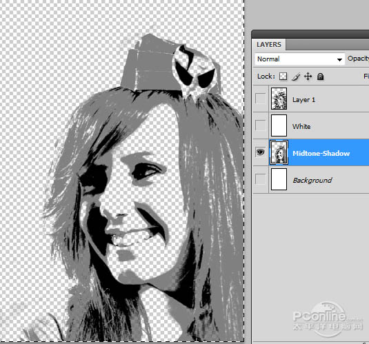 7、基本图层搞掂后,将中间调图层和头发、帽子合并为一个图层,命名为“中间调”.暗调则命名为“暗调”.取消原始肖像图层的显示,效果如下图所示。