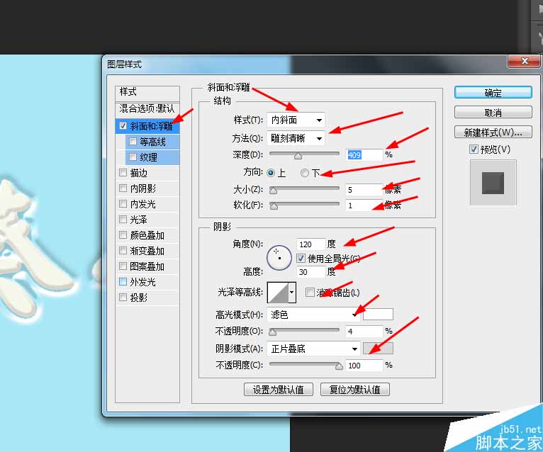 3、接着双击字体的图层添加图层样式,调整一下斜面和浮雕,等高线,如图所示
