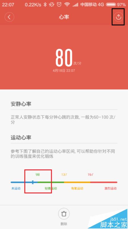 6、接下来,我们在该页面中可以看到自己的心率所处的水平阶段,当然,正常人安静的心率就和图中所示的阶梯图一样。我们可以将心率分享到社交网站,点击页面右上角的“分享”按钮。
