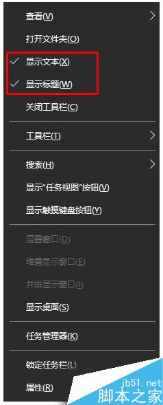 6、在任务栏上新建文件夹上单击右键,将“显示文本”和“显示标题”前面的勾去掉,我们就可以看到显示桌面图标了;