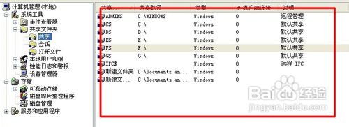 选择计算机管理---系统工具---共享文件夹---共享。就可以看到共享的文件和文件夹了。