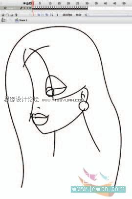 2. 在几帧后(30帧较好)插入空白关键帧(F7),然后画一个新角度的角色或对象.注意这里应使用与前一个绘制的图形有相同数量的线条你可以插入关键帧(F6),编辑相同的线条到新的角度.