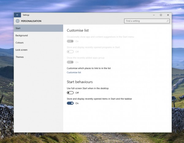 开始菜单全屏切换按钮被移植“个性化设置”中。