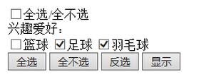 <input type="checkbox" id="c1">全选/全不选<br> 兴趣爱好:<br> <input type="checkbox" name="interst" value="basketball">篮球 <input type="checkbox" name="interst" value="football">足球 <input type="checkbox" name="interst" value="bedminton">羽毛球<br> <input type="button" id="b1" value="全选"> <input type="button" id="b2" value="全不选"> <input type="button" id="b3" value="反选"> <input type="button" id="b4" value="显示">