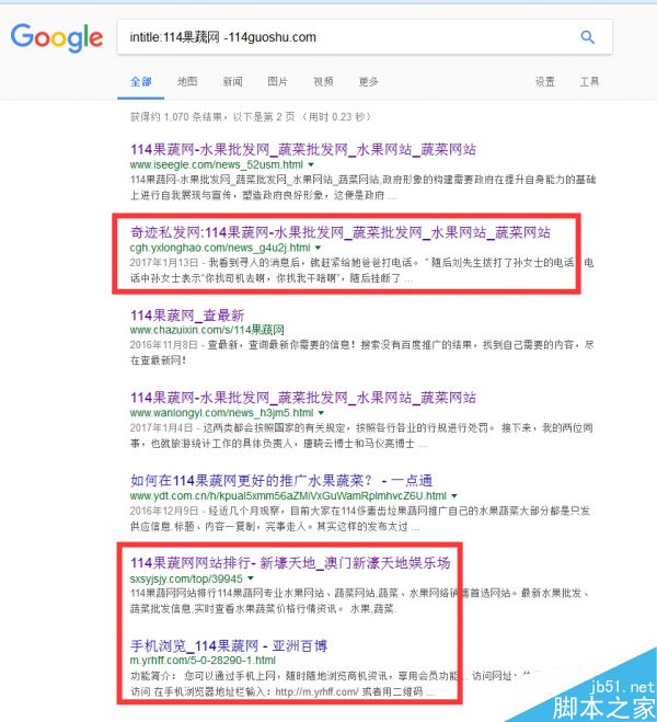 主动出击,不要等搜自己的品牌名第二个是镜像站,甚至第一个就不是自己的站的时候,或者网站已经被降权的时候再去处理,谷歌搜索自己网站的品牌名(不要问为什么用谷歌,自己想!),搜索指令:intitle:114果蔬网 -114guoshu.com