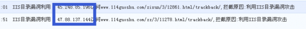 注意网址截止到.html是正常网址,但是加上/trackback/ 就会被安全软件拦截,这是利用了iis的目录漏洞利用,激发安全软件内置的特征库。然后就去查看安全软件的日志,就会很轻松的发现,镜像网站的后台ip: