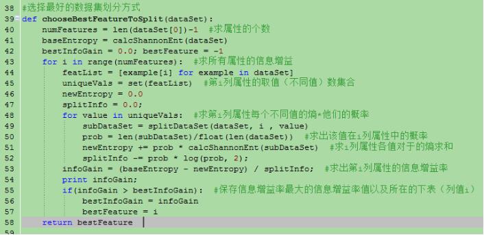 如上图,C4.5主要在第52、53行代码与ID3不同(ID3求的是信息增益,C4.5求的是信息增益率)。