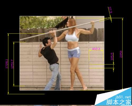 在工程应用中,很多时候我们需要得到现场尺寸,但有时候实地考察可能会有些尺寸忘记量取了,又或者一些地方因为太高等原因量不到的,怎么办呢?我们可以在现场尽量多拍一些场地的照片,这些照片都尽量包括一些尺寸标准的参照物,例如地板砖、铁方通、角铁、人物,有这些尺寸容易得到的物品作参照,就可以用cad把照片中需要的尺寸量出来了。下面举个例子来说明用法,网上找到的一张图片,已知的数据是图中女身高2050mm,我们用cad把男的身高,背景瓷砖的规格,棍子直径,后面围墙的高度都量出来。