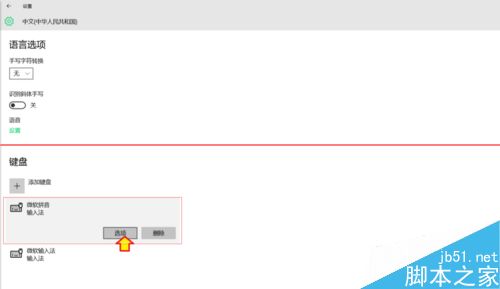 4、点击<键盘>栏下的【微软拼音】,展开后点击【选项】