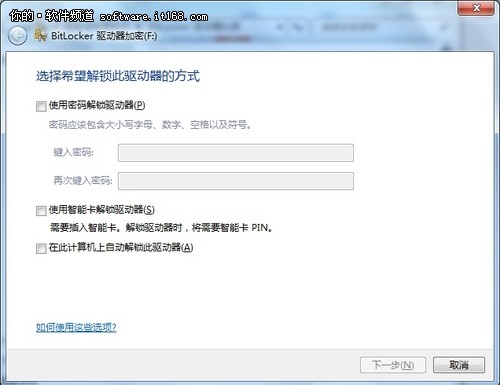 1、选择解锁方式。对某个分区进行加密时,有密码解锁、智能卡解锁、在此计算机上自动解锁三种解锁方式,用户可以根据需要自行选择。