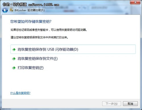 2、选择存储恢复密钥方式。用户若忘记解锁密码或丢失智能卡,则可以采用恢复密钥的方式来访问分区。用户可以选择将恢复密钥保存到USB闪存或文件中,也可以直接打印恢复密钥。