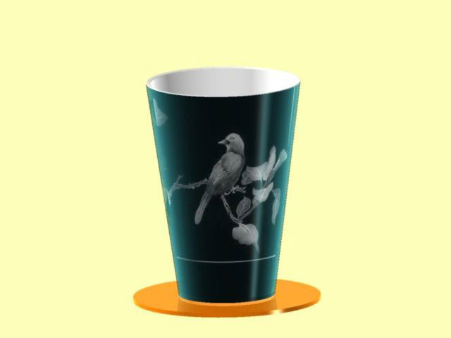 4、如果在在纹理贴图中输入光栅图,而又在不透明贴图中输入黑底色的不透明图片,那么既可反映杯面的颜色,又可反映纹理图片的彩色,但是没有原图片清晰,好像罩了一层雾面。如下图6所示。