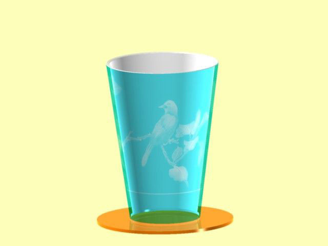 2、玻璃杯的凹凸贴图,其杯里面也宜为半透明材质,而反光度与折射值宜高。当既在纹理贴图附给彩色图片,又在凹凸贴图中附同样的图片,其渲染的凹凸贴图的效果就有彩色效果(如图2所示)。如果不在纹理贴图中附给图片,那么凹凸贴图的图案颜色就与所附材质颜色相同(这种效果的渲染图在此从略)。