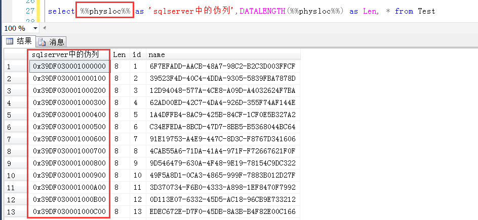 为了更加方便地观察伪列的含义,sqlserver提供了一个未公开的系统函数sys.fn_PhysLocFormatter,下面借助sys.fn_PhysLocFormatter这个函数来继续观察这个伪列