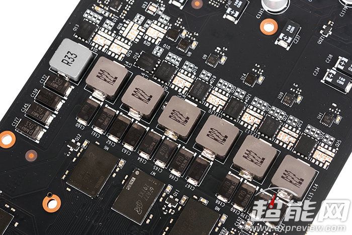 GTX 1080冰龙超级版的PCB虽然和公版一致,但是在用料方面更好,可以看到,在GTX 1080公版只有5+1相供电的基础上,冰龙超级版补全了公版PCB空焊位的相数,达到了6+1相,其中GPU核心为6相供电,显存部分为1相供电。
