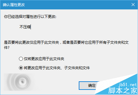 4、在属性窗口点击“确定”,此时会询问是否将此设定应用到子文件夹和文件,如果你想彻底解除压缩和加密,可以直接点击“确定”,否则在选择“仅将更改应用于此文件夹”后,再点击“确定”,如下图——