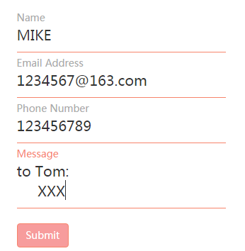<p class="title">CONTACT ME</p> <ul class="email"> <li><input type="text" name="name" placeholder="Name"></li> <li><input type="text" name="email" placeholder="Email Address"></li> <li><input type="text" name="number" placeholder="Phone Number"></li> <li class="message"><textarea name="message" placeholder="Message"></textarea> </li> <button class="btn btn-define">Submit</button> <a href="mailto" id="send"></a> </ul>