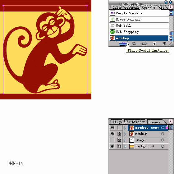 14.新建图层monkey copy,点选Symbols(符号)面板下沿插入符号的图标按钮,插入刚才定义的符号,可以双击符号重新命名用于辨识。(图N-14所示)