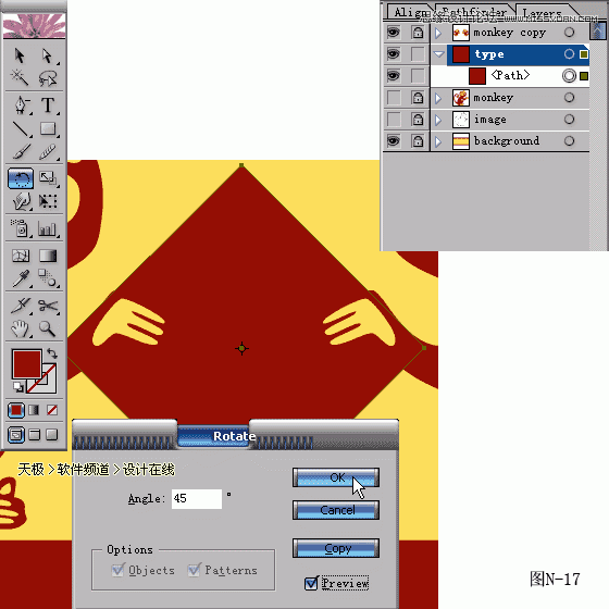 17.新建图层type,画一个红色的矩形,选中后用旋转工具按住ALT键点击变形框中心点,在弹出的对话框中选择旋转角度为45度。(图N-17所示)