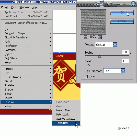 22.对50%灰色的矩形执行Effect/Texture/Texturizer(效果/纹理/纹理化滤镜),选择自己喜欢的纹理,设定合适的参数。(图N-22所示)