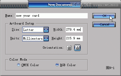 1.打开Illustrator,按CTRL+N新建文件,在对话框中定义一个文件名,选择Size(尺寸)为Letter大小,文件方向为横向。因为最后结果不是印刷输出,所以选择Color Mode(颜色模式)为RGB,可以保证图像颜色的鲜艳,也方便执行更多的效果滤镜。(图N-1所示)
