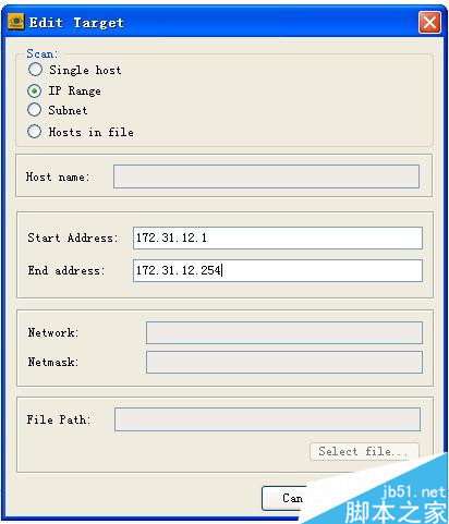 (2)设置IP范围:如图2所示,设置为IP Range。当然,这里还有其他的选项可提供选择,包括图中所示的Single Host、Subnet等,可以根据实际情况来选择。