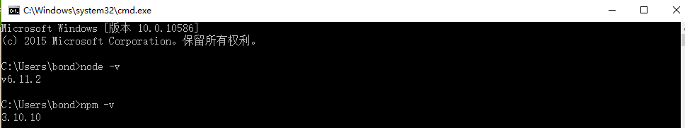 3、 “开始”-->cmd,打开cmd程序,输入“node -v”,出现” v6.11.2”; 输入“npm -v”,出现” 3.10.10”,说明Nodejs和npm都已安装成功。