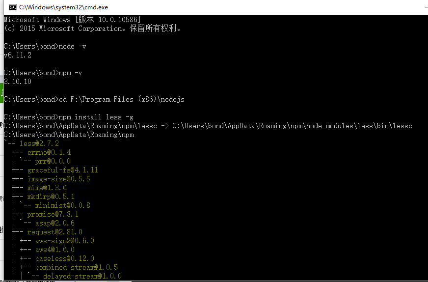 4、“开始”-->cmd,打开cmd程序,输入“cd F:Program Files (x86)nodejs”,进入nodejs安装目录。输入npm install less -g 回车,安装less组件。稍等片刻,完成后,你会发现C:UsersbondAppDataRoamingnpmnode_modules 目录下有less组件。