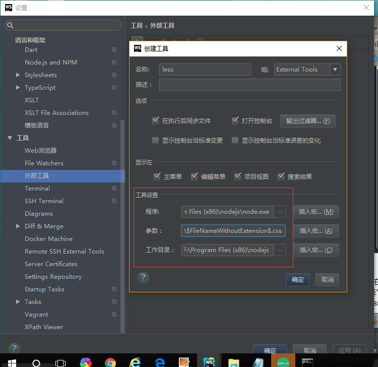6、File-->Settings,打开设置选项。找到“External Tools”扩展工具设置项,点开右侧的“+”,在Name栏输入“LESS”,“Tool settings”分别输入如下:
