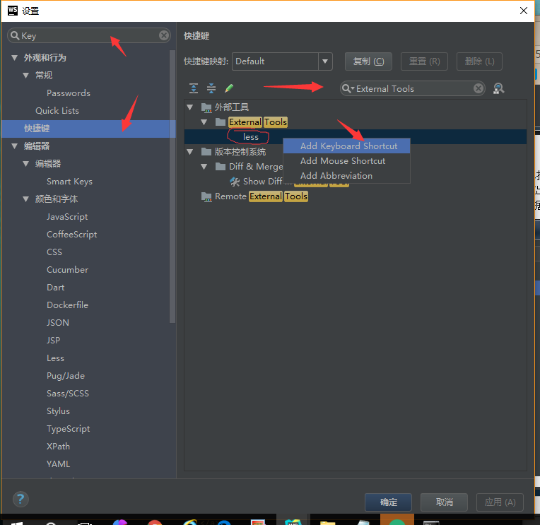 7、在Settings 面板顶端输入“key”,找到快捷键设置项“Keymap”,在右侧找到“External Tools”点开,点选“LESS”并单击右键,选择“Add Keyboard Shortcut”,在出现其面板的“First Stroke”处同时按下“Alt+L”键,这样就将“Alt+L”设置为将less文件编译成css文件的快捷键。