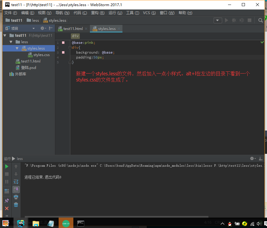 至此Windows7 x64系统下安装Nodejs及配置less组件已基本完成,接下来我们配置WebStorm 2017.1,使其能将less文件编译成css文件。