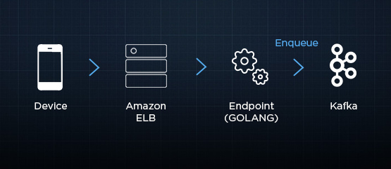 这个服务使用GO语言编写,这个服务使用了亚马逊弹性负载均衡器(ELB),并将每一个消息负荷放入一个持久化的Kafka队列。