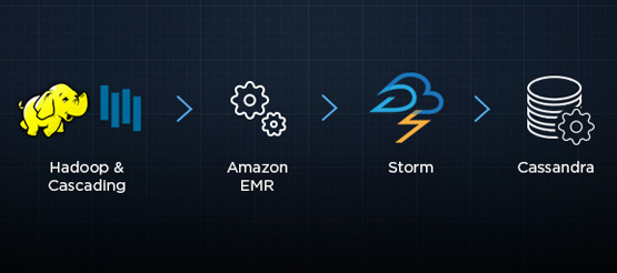 Twitter使用Cascading框架编写、Amazon EMR执行MapReduce程序。 Amazon EMR将Twitter存储到S3上的数据作为输入,处理完毕后,再将结果存入S3。Twitter通过运行在Storm上的调度topology来探测程序执行完毕,并将结果灌入Cassandra集群,这样结果就能用于亚秒级查询API。