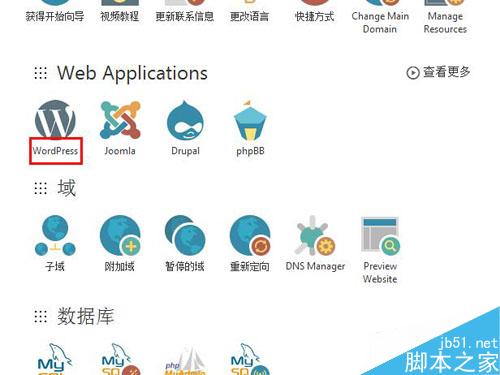 2.在cPanel面板中的Web应用程序菜单栏中找到“WordPress”程序,点击安装。